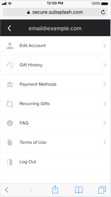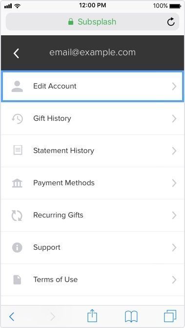 If you need to update your Subsplash account information, head to the Subsplash Giving donation page. Click on the profile icon in the upper-right-hand corner of the banner and log in. From there, you can select Edit Account. In this section, you can edit your name, phone number, address, and change your password. Make sure to scroll down and update any information that has changed, and hit save at the bottom!